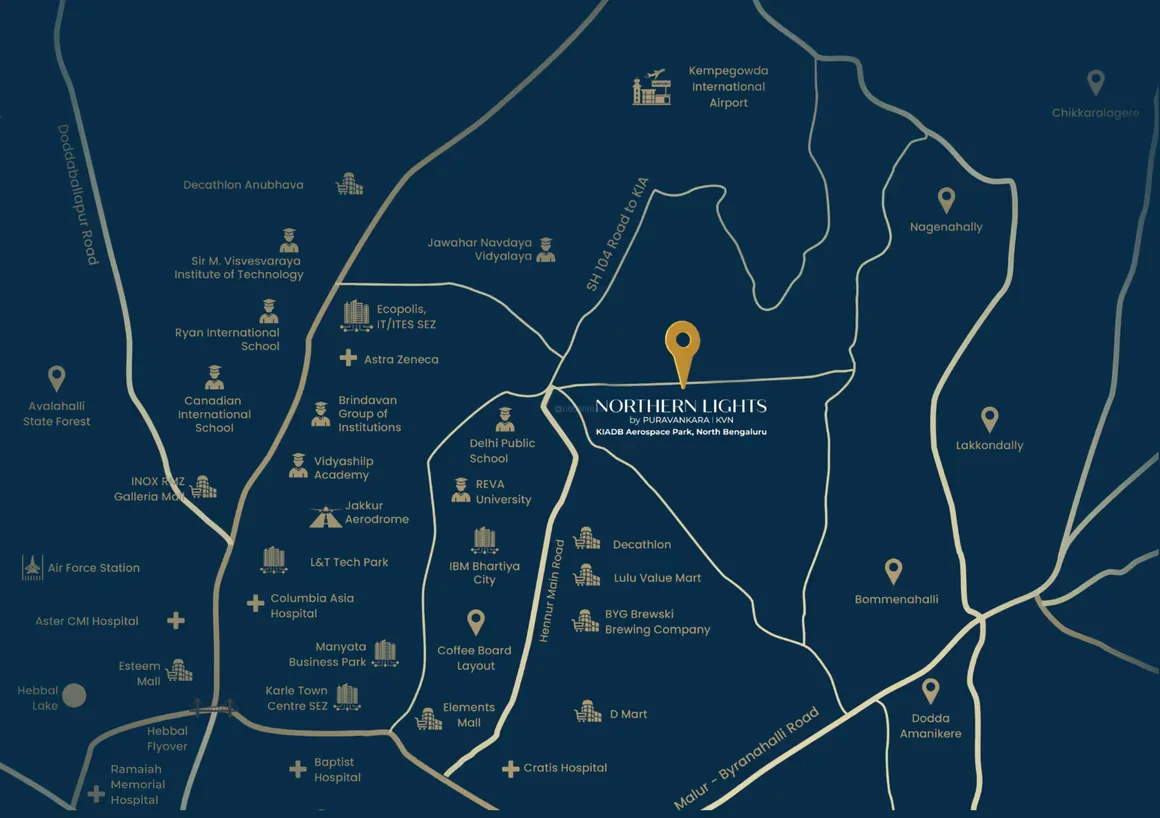 Purva Northern Lights is a premium residential township in Bagalur, North Bangalore, spread across 24.5 acres of thoughtfully planned development. This low-density project features 8 iconic high-rise towers (B + G + 28/31 floors) with only 6 exclusive homes per floor, ensuring privacy and spacious living.